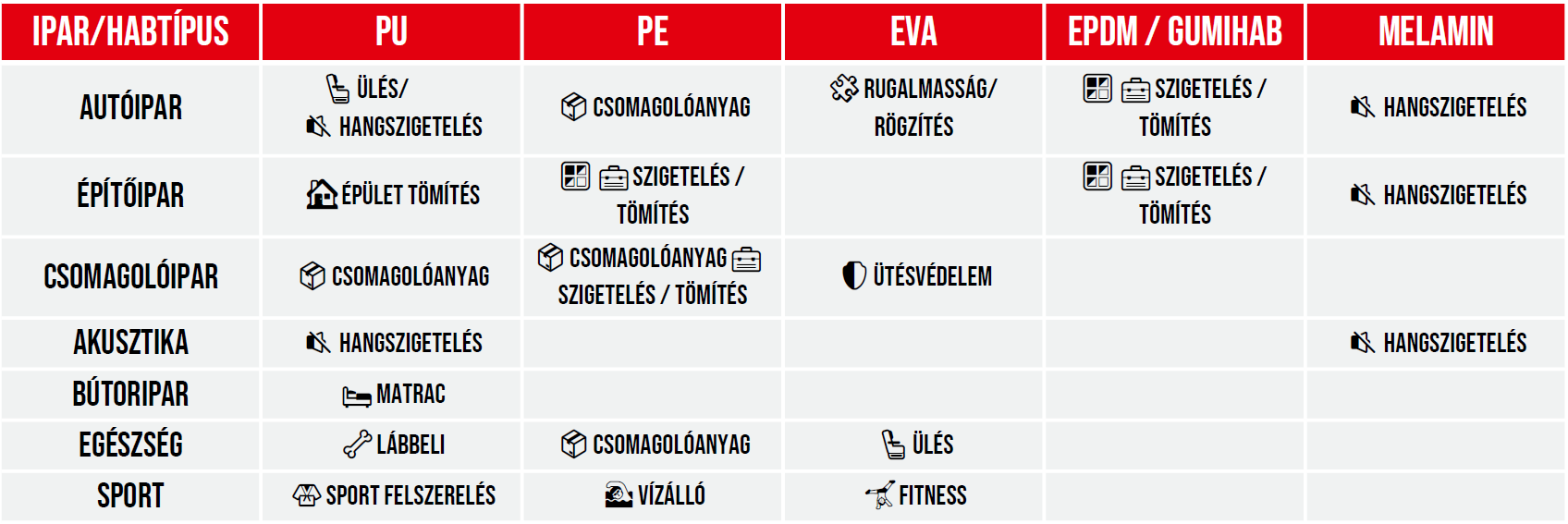 Fő tulajdonságok: nyitott vagy zárt cellaszerkezet, rugalmas, légáteresztő, ülőfelület/komfort alkalmazásokra is alkalmas